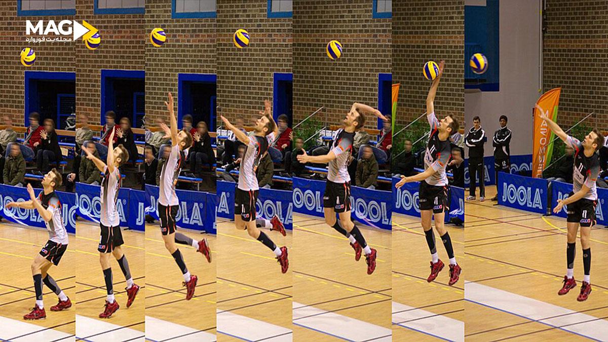 - با دست مسلط در بالاترین نقطه پرتاب توپ به آن ضربه بزنید و دست خود را در امتداد ضربه دنبال کنید تا دقت و قدرت بیشتری ایجاد شود.