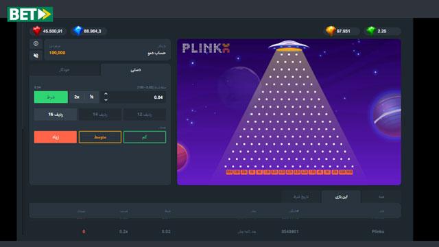 بازی پلینکو (Plinko) یک بازی هیجان‌ انگیز و جذاب است که در ابتدا در برنامه تلویزیونی «The Price is Right» محبوب شد و امروزه نسخه‌ های آنلاین آن نیز بسیار مورد استقبال قرار گرفته‌ اند. در این بازی، بازیکن یک توپ یا دیسک را از بالای یک تخته که پر از پین‌ های کوچک است، رها می‌ کند. دیسک با برخورد به پین‌ ها به صورت تصادفی به اطراف حرکت کرده و در نهایت در یکی از خانه‌ های پایین تخته فرود می‌ آید.