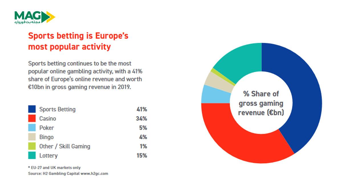 شرطبندی ورزشی همچنان بزرگترین سهم از درآمدهای قمار آنلاین را دارد که معادل ۴۱٪ است و در سال ۲۰۱۹ ده میلیارد یورو درآمد ناخالص بازی (GGR) از این بخش به دست آمد.