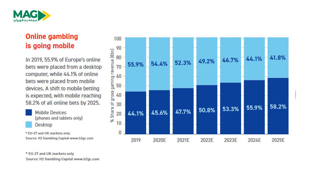 این رقم در مقایسه با دیگر مارکتهای کلیدی پایین است. در سال ۲۰۱۹، ۵۵.۹٪ از شرطبندیهای آنلاین در اروپا از رایانههای دسکتاپ انجام شد و تنها ۴۴.۱٪ از شرطبندیهای آنلاین از دستگاههای موبایل صورت گرفت. تا سال ۲۰۲۵، انتظار میرود که تغییرات بیشتری به سمت شرطبندی موبایلی ایجاد شود و پیشبینی میشود که ۵۸.۲٪ از کل شرطبندیهای آنلاین از طریق موبایل انجام شود.