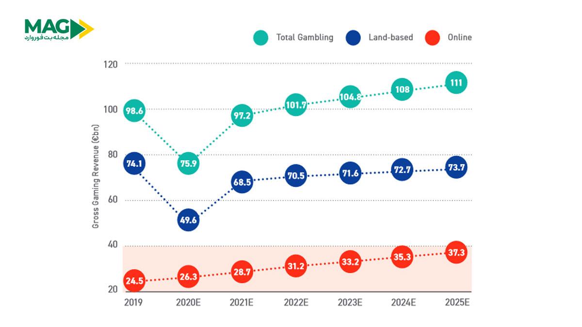 پیشبینی میشود که درآمد کلی مارکت شرطبندی اروپا تا سال ۲۰۲۵ به ۱۱۱ میلیارد یورو برسد که بیش از ۳۳٪ آن مربوط به شرطبندی آنلاین خواهد بود.