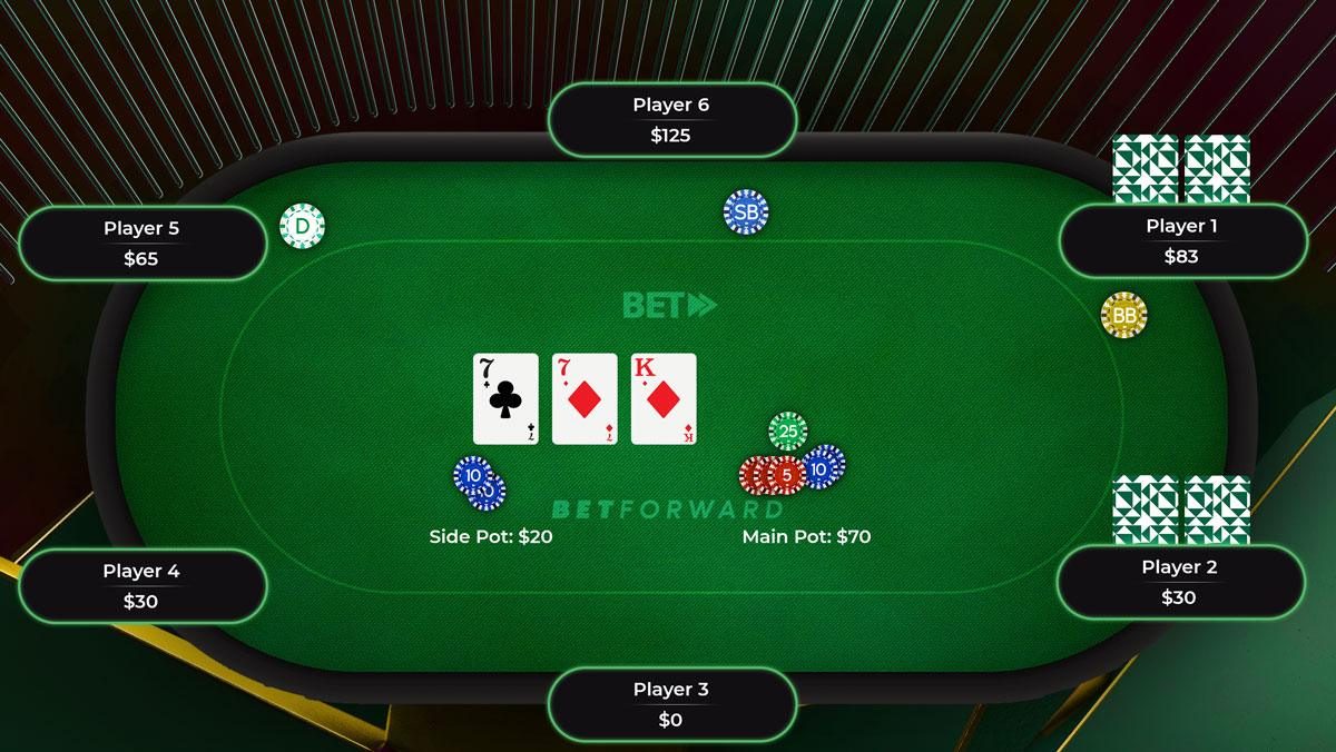 اگر بازیکن ۴ کال کند، یک ساید-پات ایجاد می‌شود. پات اصلی یا Main Pot شامل پول‌هایی می‌شود که شامل چیپ هر ۳ بازیکن است (و مطابق با بازیکنی که کمترین چیپ را دارد محاسبه می‌شود) و ساید-پات شامل پول‌هایی می‌شود که بعد از آل این توسط بازیکنان دیگر شرط‌بندی شده است.