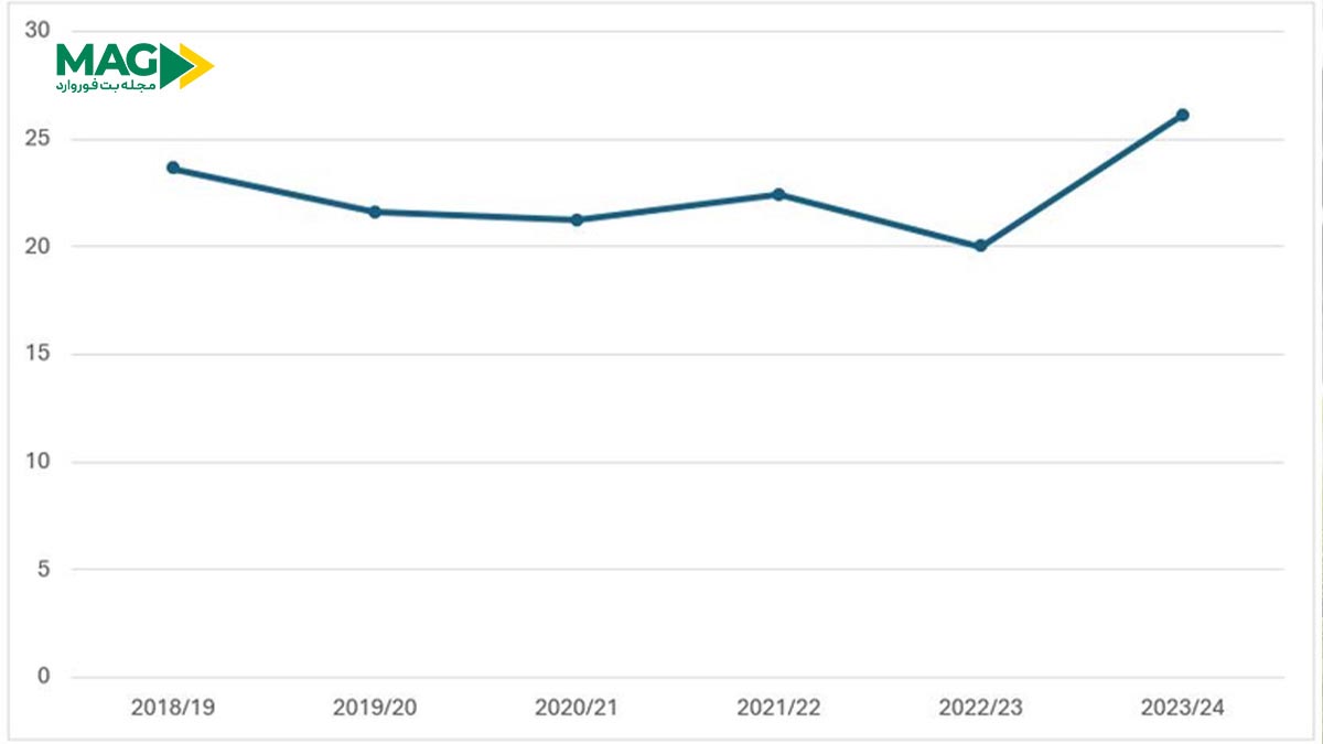 اما هیچ شکی نیست که وقتهای اضافه بیشتر = گلهای دقایق پایانی بیشتر؛ این یک منطق عددی ساده است. برای دید بهتر، در ادامه درصد گلهای ثبتشده در بازه ۷۶ تا ۹۰ دقیقه در هر فصل لیگ برتر انگلیس نشان داده شده است.