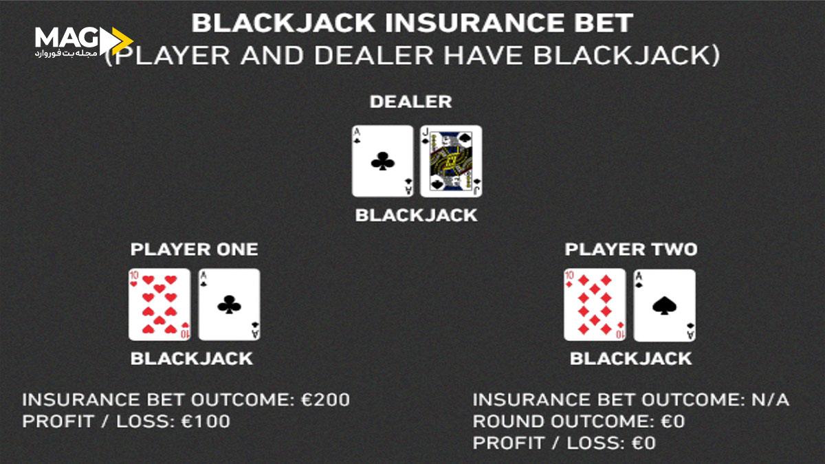 - بازیکن دوم نیز بلکجک میشود اما شرط بیمه را نمیپذیرد. دیلر نیز جک میکشد و بلکجک میشود. در این حالت، بازیکن دوم نه میبرد و نه میبازد.